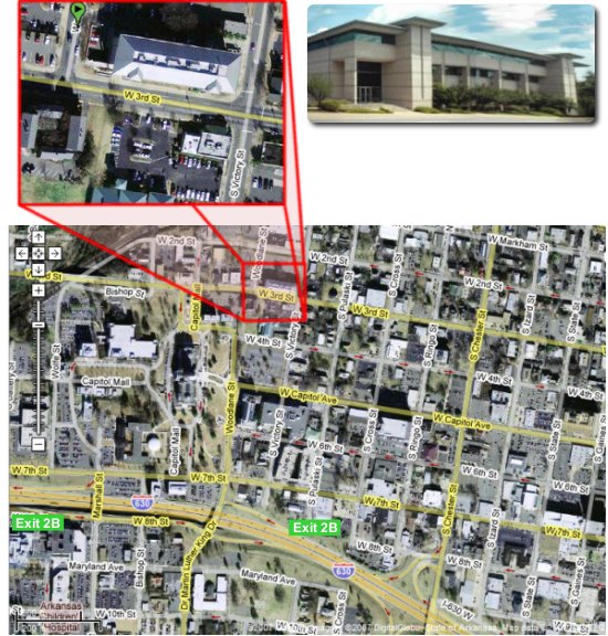 From the West: From I-430, follow signs for Downtown/I-630/Baptist Med. Center/University Ave and merge onto I-630 East. Take exit 2B toward Marshall Street / Dr. Martin Luther King Jr. Drive. Turn left at Marshall Street. Turn right at West 7th Street. At the next traffic light turn left on Woodlane Street. Turn right at West 4th Street. Turn left at South Victory Street. Turn left at West 3rd Street. Turn right at Woodlane Street.